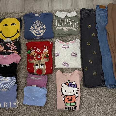 H&M barneklær for jente i størrelse 134. Flere plagg i forskjellige flerfargede mønstre og materialer. Passer til barn i alderen rundt 8-10 år.