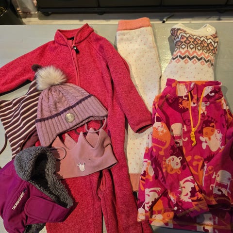 Vinter jakke, bukse. Ull one piece. Strikk.