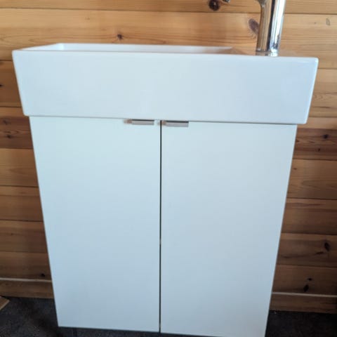 Kjøpte for lite servantskap. Kun hengt opp på vegg og tatt ned igjen. Topplate ble ikke montert på servantskap. Sort håndtak følger med. Har ikke servant og blandebatteri da det ble brukt på nytt 120 servantskap. Originale veggfester følger ikke med men har blitt erstattet med ikea veggskinne som er tilpasset servantskapet.