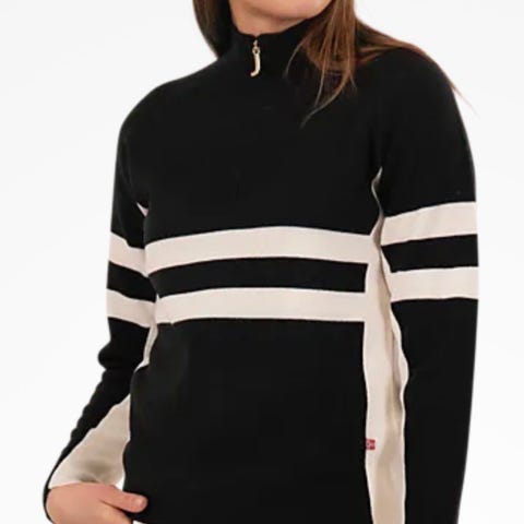 Strikket ullgenser med half-zip i premium ull som føles myk mot huden. Feminint snitt med utsvingte ermer og detaljer i kontrastfarge på overarm.