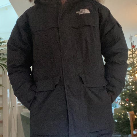 The North Face vinterjakke i størrelse XL, farge rød med svarte detaljer. Jakken er fylt med dun som isolasjonsmateriale, egnet for kalde vinterforhold. Designet for menn.