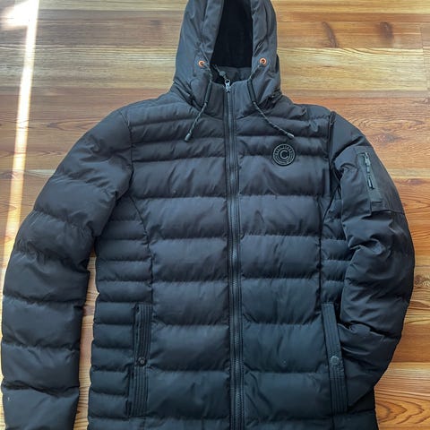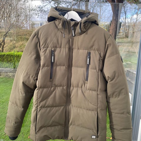 Pent og godt brukt parkas fra car jeans. Kjøpt i 2021. Jakken er kjempegod med fire ytterlommer og en lomme på innsiden. Hetten kan forlenges. Har vasket i maskin en gang for noen år siden, så et parti dun på ryggen har klumpe seg litt, men om noen er drevene kan dette jevnes ut. Knappen på ene ytterlommen er løsnet, men om noen er god på nål og tråd funker den igjen.