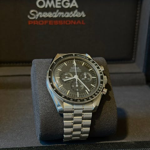 Selger en meget flott Omega Speedmaster Moonphase med elegant blå urskive. Dette er en ikonisk Speedmaster som kombinerer klassisk kronografdesign med månefase-komplikasjon.