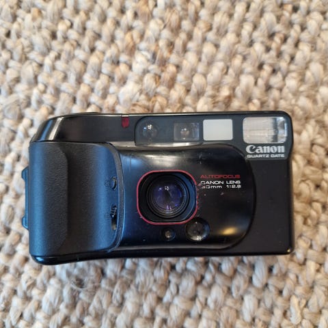 Canon Prima BF Twin filmkamera i svart farge. Kameraet har innebygd blits og manuell innstilling for ulike fotograferingssituasjoner. Designet for bruk med 35 mm film.