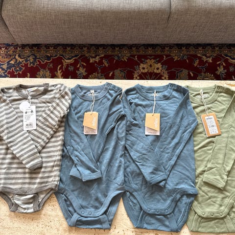 Selger fire ullbodyer, tre fra Joha og en fra Reflex i str 98. Bodyene er kun brukt en sesong og ser veldig fine ut. Et lite hull på den ene grønne, se bildet. Selges samlet for 200,-