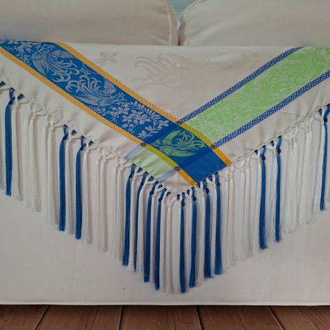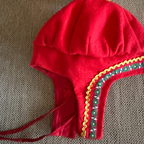 Størrelse 14-16 år eller slank voksen?Lengde 100 cm fra skulder, belte 70 cm. Sannsynligvis fra 50-tallet eller tidligere. Ble gitt til tannlege nordpå som betaling for behandling. Ikke brukt hva vi vet. Noe sømreparasjon nødvendig på det ene ermet, se bilde.