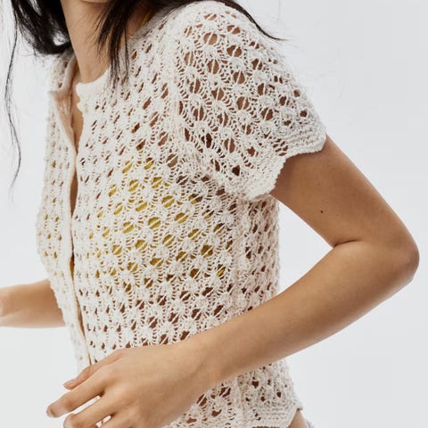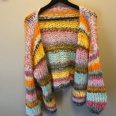 Vårfrisk strikket cardigan i myk ull selges. Den er kjøpt brukt, men kun brukt et par ganger av meg da den ble litt liten i størrelsen. Vil si den er en s/m.