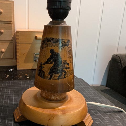 Vintage trelampe. Ledning uten jording, så denne må byttes, evt bruke lampen med en trådløs pære
