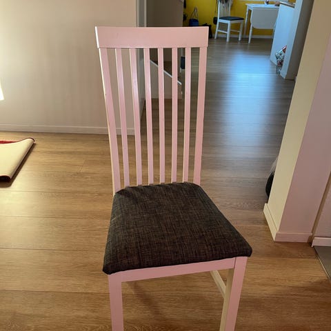 6 IKEA stoler med mørke grå trekk. Stolen har hvite ben og et sete med mørke grå stofftrekk. Passer til bruk ved spisebord eller som ekstra sitteplass.