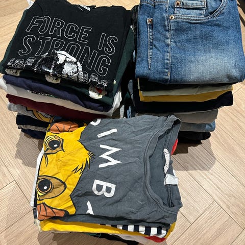Klespakke med flere sett i str 122/128 og 128. Brukt samtidig, så ganske lik i størrelsene.