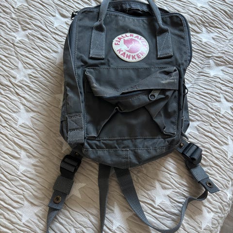 Svart Fjellräven Kånken Mini selges. Det er montert originale shoulder pads så den er bedre å bære. Selges for prisen av shoulder padsene 😉