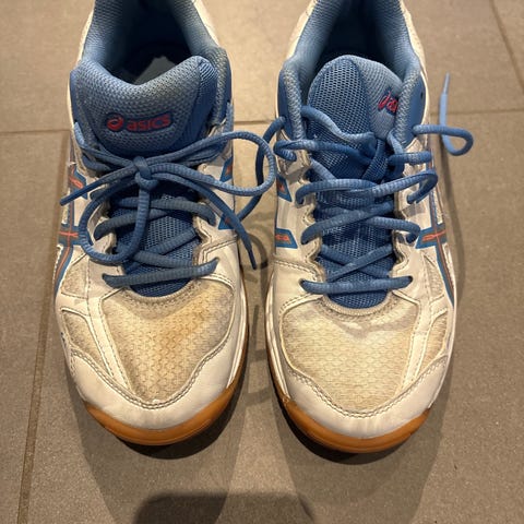 Mizuno Wave Lightning Z6 innebandysko i størrelse 36,5. Skoene har en hvit base med røde og blå detaljer. Materialet er tilpasset for innendørs bruk med god støtte og komfort.