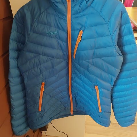 Dunparka fra Kari Traa i fin olivengrønn farge, str L. Slitt ved begge lommer, men synes lite når de er kneppet. Selges derfor billig.