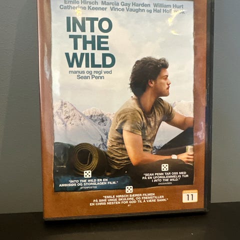 Into the Wild DVD med original cover. Filmen er regissert av Sean Penn og inneholder skuespillere som Emile Hirsch, Marcia Gay Harden, William Hurt, Catherine Keener og Vince Vaughn. DVD-en har norsk tekst og er i standard DVD-format.