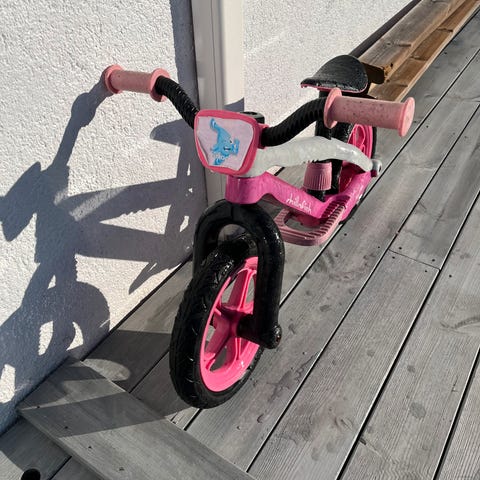 Fin balansesykkel i treverk. En del merker og småskader, men kan fint males så blir den nesten som ny.
