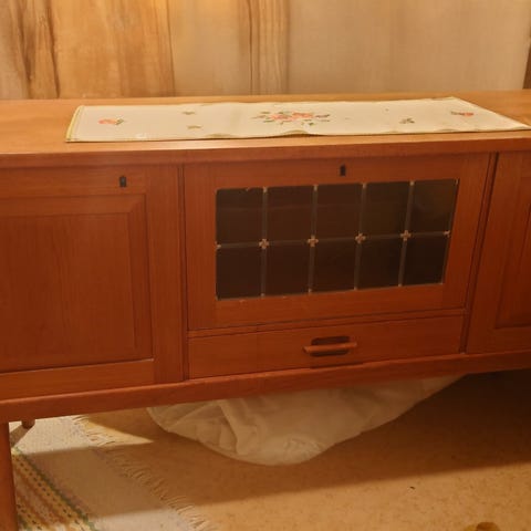 Finishen trenger litt oppfriskning så er skjenken gulle god igjen. To av metalldingsene rundt nøkkelhullene er falt av, men de følger med.