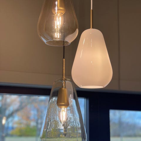 Vi selger vår nydelige Nuura designlampe. Modellen er Miira 6 pendel med klart glass og messingfarget. Det er er nydelig lampe hvor pendelen kan reguleres i høyde. Den er også dimbar. Vi har flyttet til et gammelt hus med lav takhøyde, og finner dessverre ikke plass til den nå. Derfor velger vi å selge den. Den er kun to år gammel. Ingen synlige merker og er nå pakket ned, derfor kun bilder fra nett på denne annonsen. Lampen kan selvfølgelig sees hos oss.
