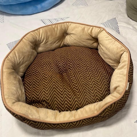 Hundeseng laget av grått kunstskinn. Passer som en komfortabel liggeplass for hunder.