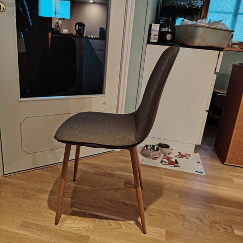 Bordplata er eikefiner, Ramma og beina er heiltre. Tungt og god kvalitet.
