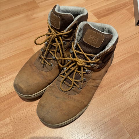 Puma støvler i størrelse 43. Støvlene har snøring og en solid såle med godt grep. Fargen er lys brun med svarte og gule detaljer. Egnet for utendørs bruk. Lite brukt og selges dade er litt for små