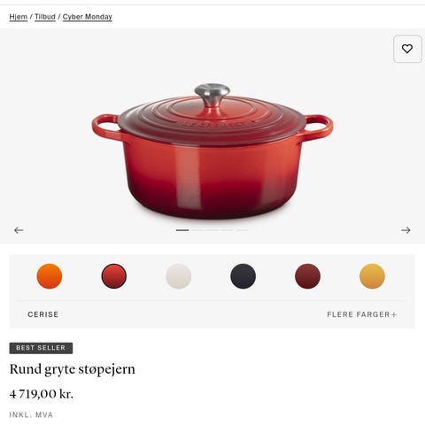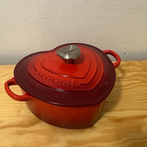 Le Creuset skålsett i rød emaljert støpejern. Inkluderer en stor gryte med lokk og fire mindre skåler.