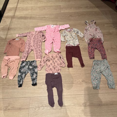 4 gensere, 3 tskjorte/singlett, 3 smekker, 6 body, 6 kjoler, 6 strømpebukser 1 pysj, 3 sommerpysj, 5 bukser, 2 luer, 1 shorts