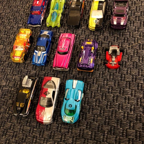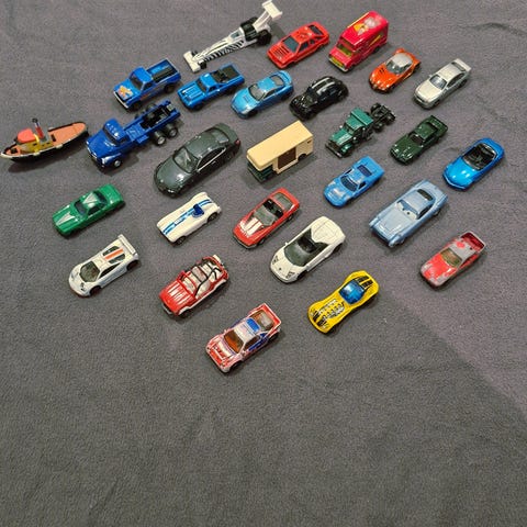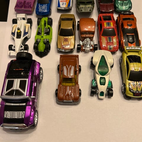 19 Hot Wheels biler og monstertrucker i forskjellige størrelser og farger. Truck og 4 biler av andre merke føler med. Egnet for barn som liker billek og samling.