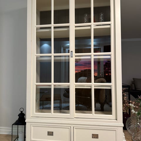 Pent, solid eldre vitrineskap. Noen bruksmerker hvor maling er flasset litt av men skapet er ellers pent brukt og i god stand.