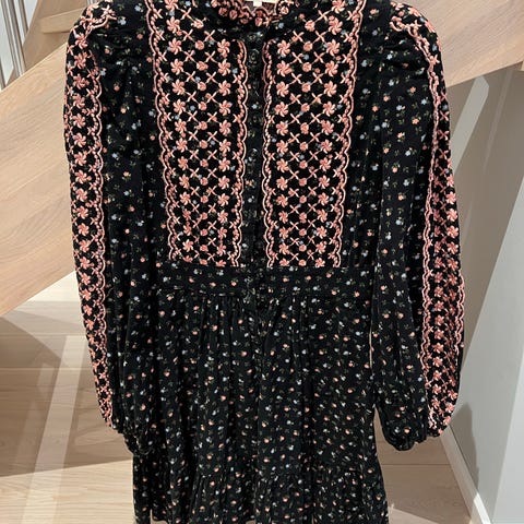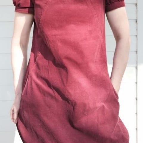 Nydelig kjole i cord, gråblå farge. Lekker puff i skuldrene, knapper i front og belte.