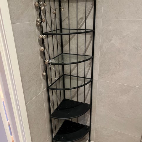 Hjørnehylle i metall med tre nivåer, egnet for oppbevaring i hjørner. Designet for å maksimere plassutnyttelse i rom som bad eller kjøkken