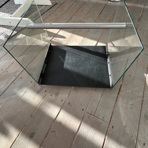 Praktisk og pen vedhylle/vedstativ i glass. Ukjent merke, men finner tilsvarende stativer på nett til rundt 2.000kr.