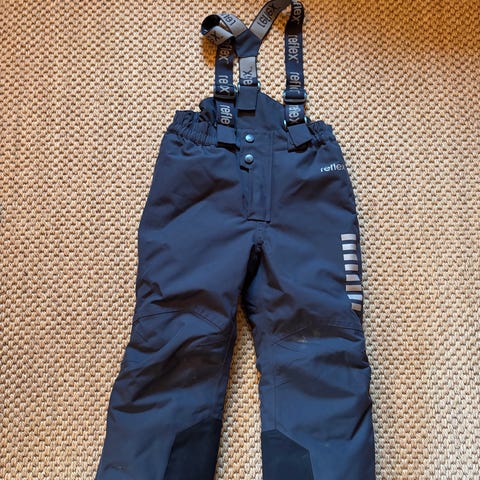 Bergans foret skibukse i størrelse 104, unisex modell i svart farge. Laget av polyester materiale. Passer for barn og har justerbare stropper og gummistrikk for å hindre snø inn i støvler.Har et lite hull ved glidelås foran, se bilde. Ellers mangler strikker under sko, disse kan kjøpes separat og festes med knapp