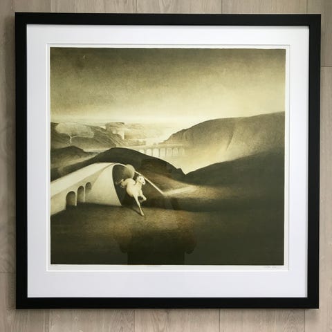 Flott/stort Litografi E.A. "Badeengel" Signert Vebjørn Sand. Ny innramming med AR70 Kunstglass.