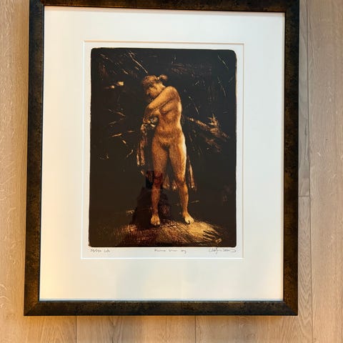 Stort flott E.A. Litografi "Badeengel" Signert Vebjørn Sand Ny ramme/Kunstglass.