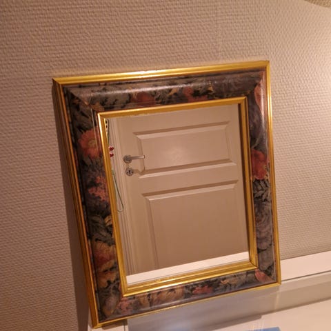 Northen ligth speil med lys rundt kanten. Speilet har en hvit ramme og er utstyrt med flere lyspærer som gir belysning. Kan plasseres på vegg eller stående med støtteben. Materiale og størrelse ikke spesifisert.