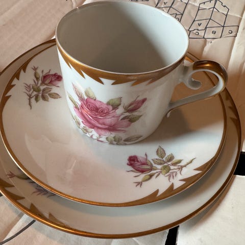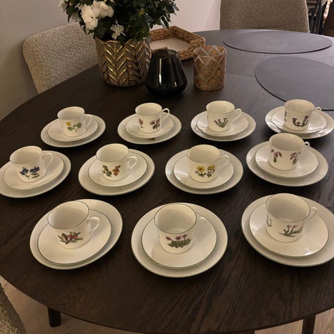 Seks kopper med fat, seks tallerkener. Én tallerken med skår. Må hentes.