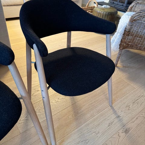 Selger tre Bolia Sleek stoler i oljet eik. Stolene er kjøpt nye januar 2021 og selges nå på grunn av flytting. Stolene er veldig pent brukt, eneste bruksmerker er noen små naturlige sprekker i det treverket på setet, se bilder.