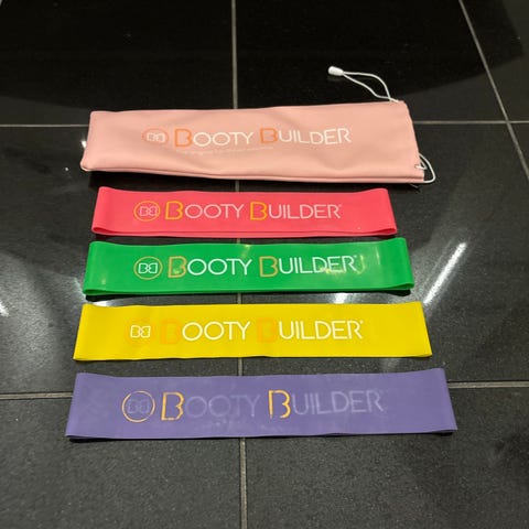 Booty Builder treningsstrikker i sett med 5 stk i ulike farger. Egnet for styrketrening og rehabilitering. 4 forskjellige motstandsnivåer: X-Light (3-4 kg), Light (11-13 kg), Medium og Heavy (20-23 kg).Inkluderer en rosa oppbevaringspose.. Et par er prøvd, en ligger fortsatt i pose.