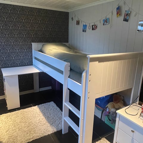 Godt brukt halvhøy seng. Det er mulig at det mangler noen skruer, men sengen kan settes sammen. 90*200 madrass