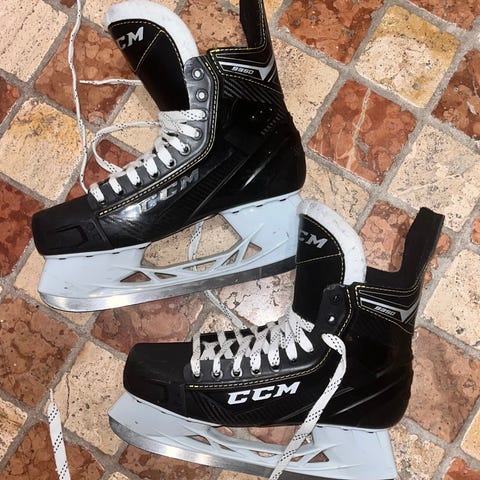 CCM AS 550 SR ishockeyskøyter i størrelse 44. Skøytene er sorte med hvite detaljer og har regular bredde. Egnet for ishockeybruk.