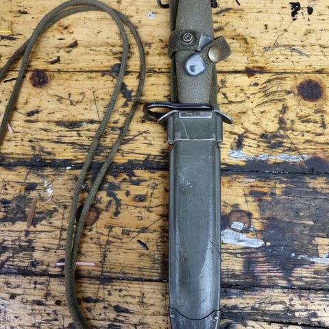 bajonett med metallblad og trehåndtak. Leveres med svart slire i lær eller imitert materiale. Bajonetten har preget produksjonsmerker på bladet.