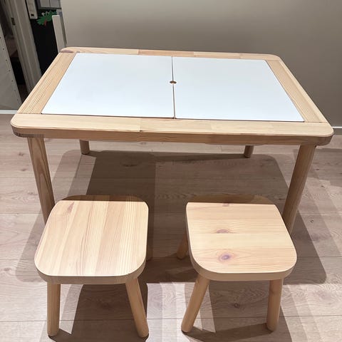 IKEA Flisat lekebord med ramme i tre og hvit bordplate delt i to. Bordet har to gule oppbevaringsbokser integrert under bordplaten. Passer til barn for lek og aktiviteter.