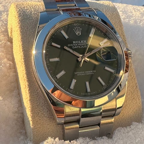 Selger min utrolig fine Rolex Datejust 41mm med nydelig blå azzuro urskive og fluted bezel i hvitt gull.