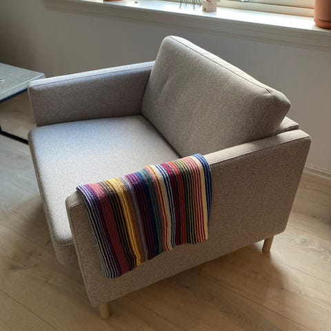 209 cm. med to puter i sete. Puter og armlenetrekk har glidelås og kan vaskes i maskin med ullprogram.