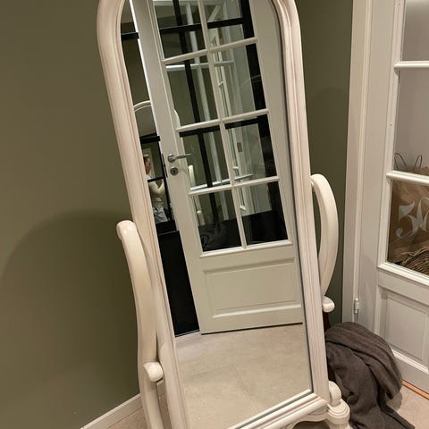 speil med dekorativ svart ramme. Speilet har en detaljert og utsmykket ramme med klassiske ornamenter. Egnet for bruk i gang, stue eller soverom som et frittstående eller veggmontert speil.