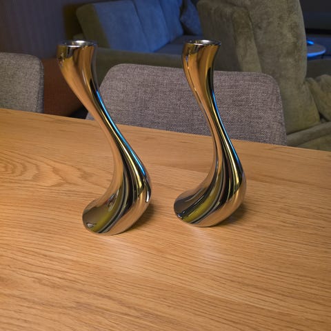 To stykk Georg Jensen lysestake laget i rustfritt stål. Produktet har et moderne design med sammenflettede detaljer.