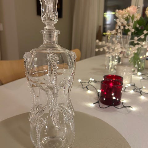 Liten karaffel med lokk. Høyde ca 14 cm med korken på. Noen merker nederst på korken, dette synes ikke når korken står på. Se detaljbilde.