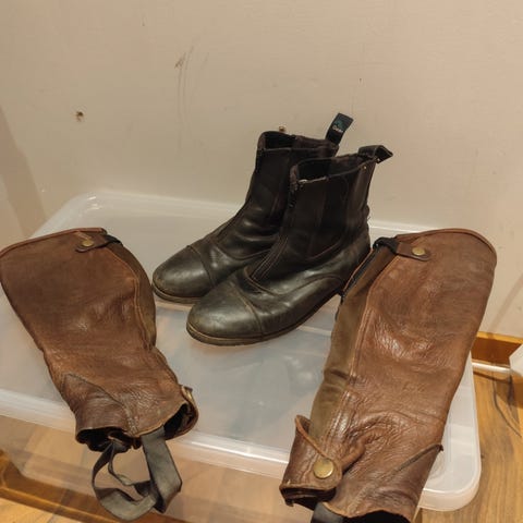 Skinngamasjer i størrelse XL med svart farge. Bra alternativ til ridestøvler hvis du vil bruke vanlige sko.