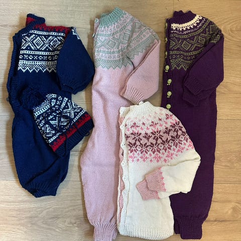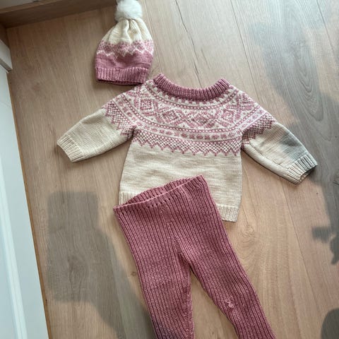 Selger diverse strikket tøy. Størrelsen passes ca 4-6 år. Pannebåndet er fra name it og er 2-4 år, men passer også en 6 åring.