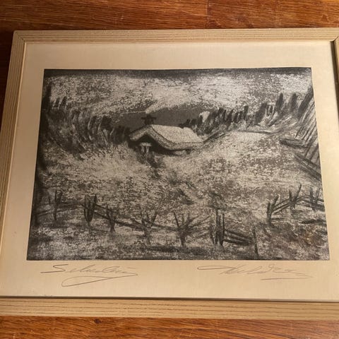 Selger et fint landskaps akvarell av Eldar Olderøien. Maleriet er fra Ånøya (Melhus - Trøndelag).